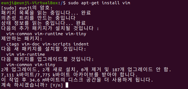 목록이 뜨지만 vim이 실행이 되지 않으므로 다시 설치를 해준다.