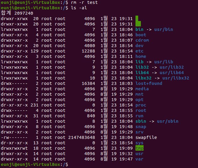 mkdir를 사용한 후 디렉토리 목록을 확인하였더니 test라는 디렉토리가 만들어 진 것을 확인할 수 있었다.